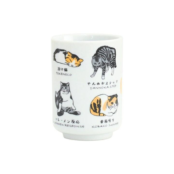 いろいろな姿のねこちゃんがぐるりと一周描かれたユニークで可愛い寿司湯呑です。 サイズ:Φ7.2×H10.2cm 容量:280ml(満水時) 素材:陶磁器 ・電子レンジ〇 ・食器洗浄機〇 ・オーブン×