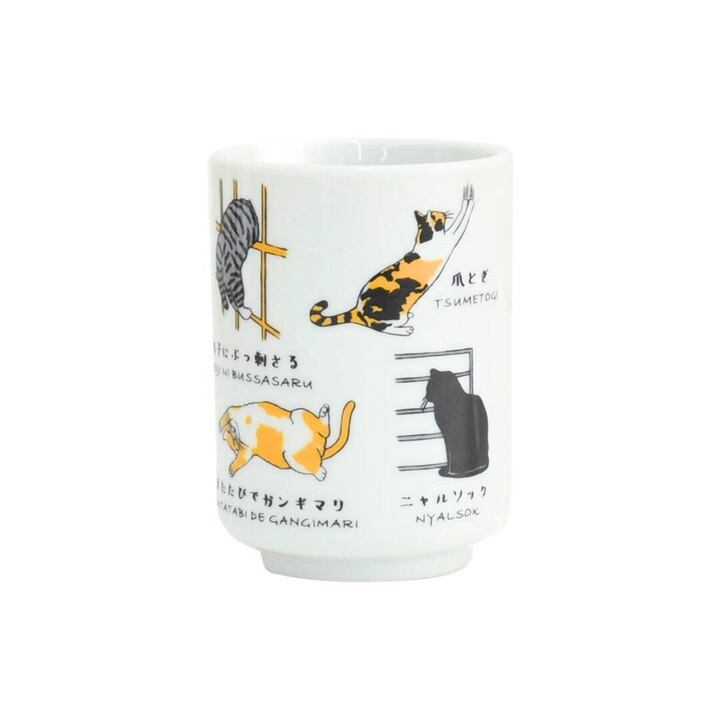いろいろな姿のねこちゃんがぐるりと一周描かれたユニークで可愛い寿司湯呑です。 サイズ:Φ7.2×H10.2cm 容量:280ml(満水時) 素材:陶磁器 ・電子レンジ〇 ・食器洗浄機〇 ・オーブン×